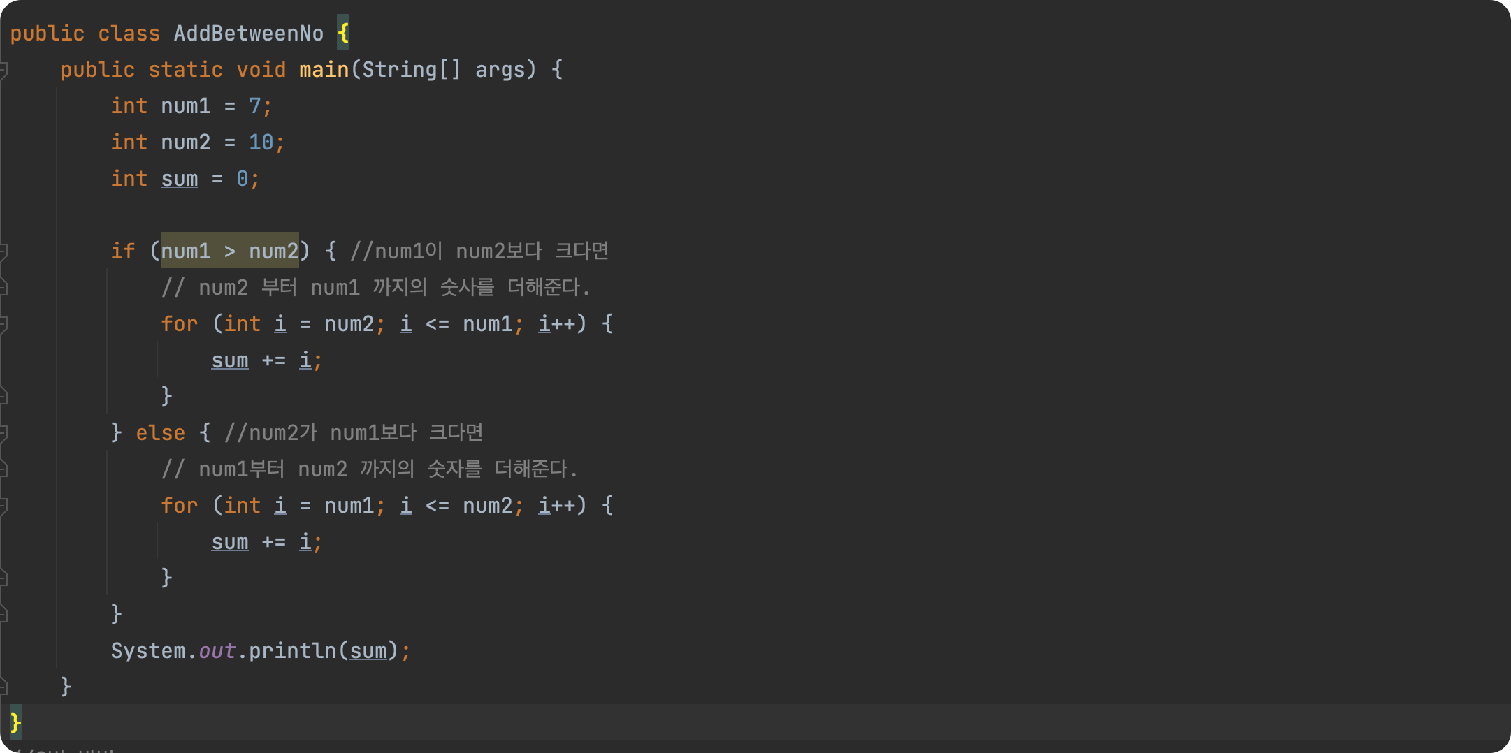 for문 ( 작은 수 부터 큰 수 까지 하나씩 덧셈해 준다.)