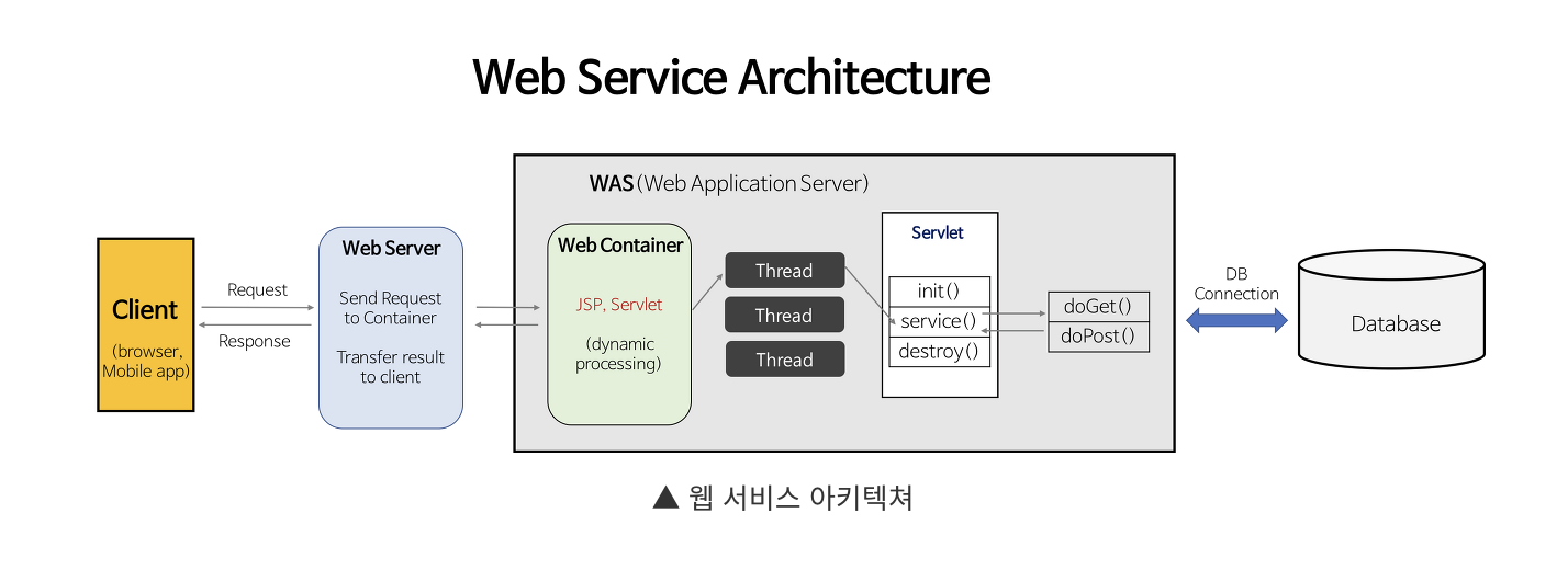 - WAS는 JSP, Sevlet 구동환경을 제공해주기 때문에 웹 컨테이너 혹은 서블릿 컨테이너라고도 불린다.