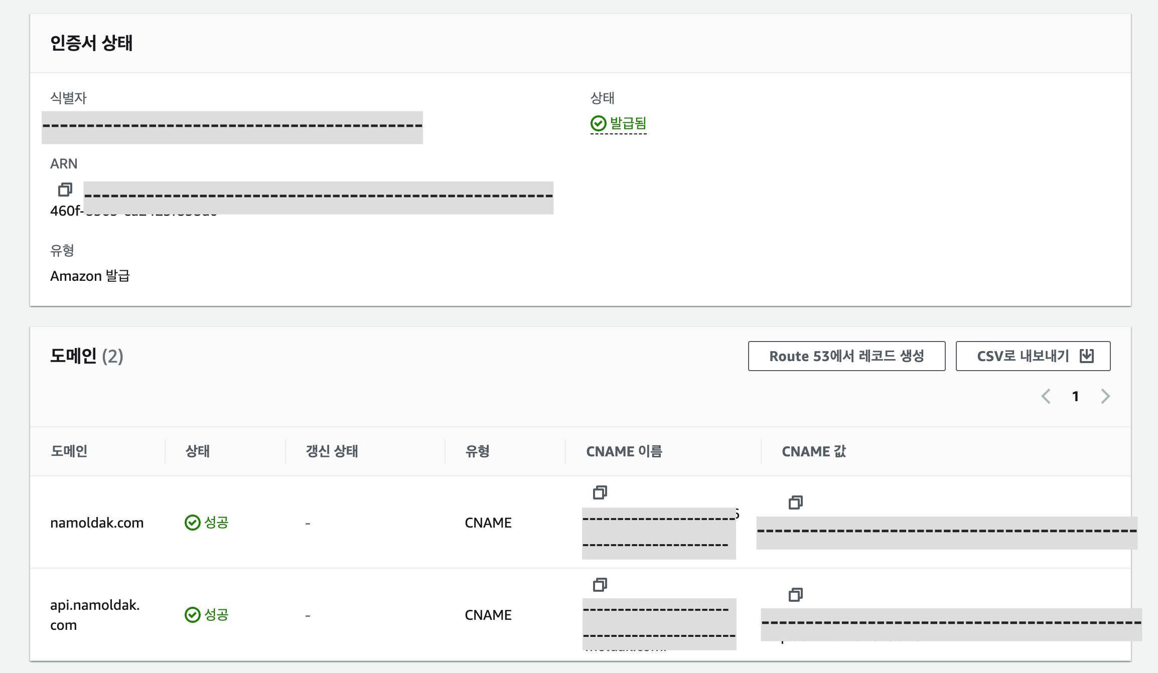사용하는 인증서에 백엔드 주소(api.namoldak.com), 프론트엔드 주소(namoldak.com) 모두 등록해 주었다.