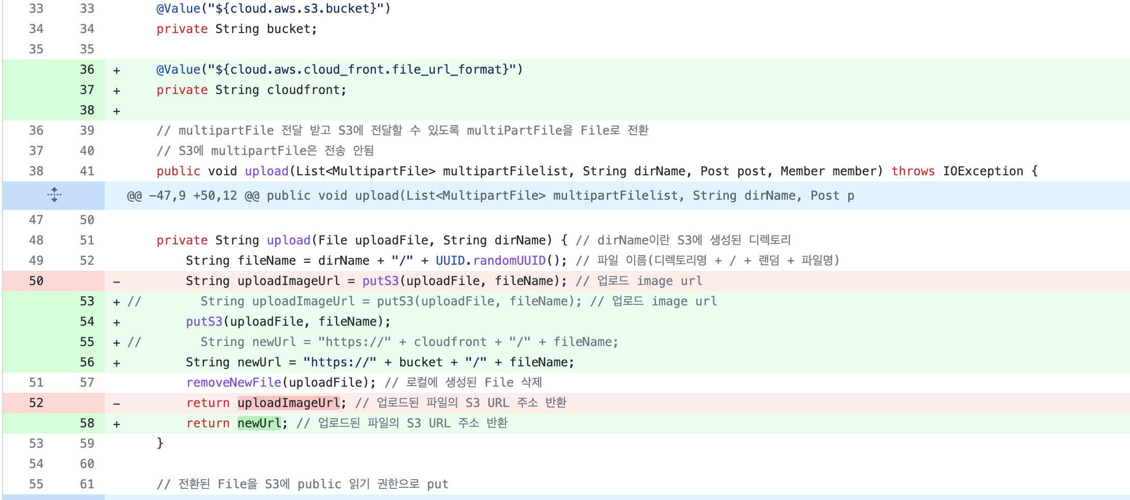 - 현재 코드에서는 게시글에 이미지를 업로드하면 S3 버켓 주소가 이미지 url 주소에 그대로 노출되고 있었다. 시니어 개발자님이 이 엔드포인트 부분을 그대로 노출시키면 안된다는 피드백을 주셔서 오늘은 팀원들과 그 부분을 수정하는 작업을 했다.