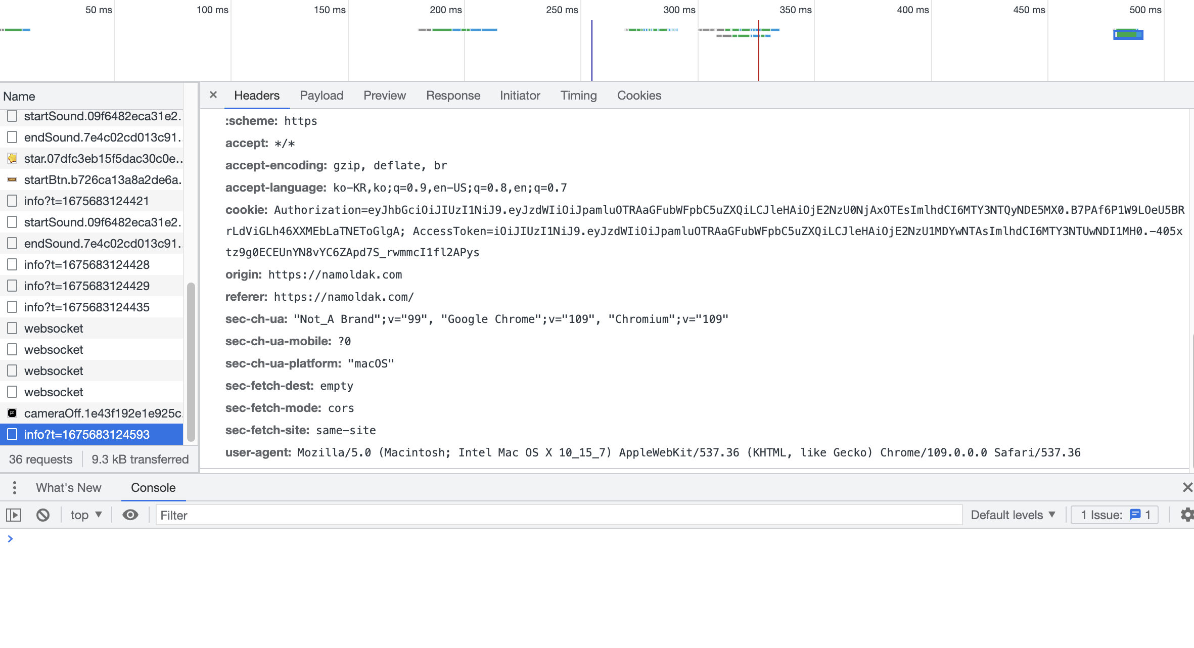 - 처음에 의심한 부분은 아래 사진과 같이 다른 페이지들에서는 Request Header 부분에 키값이 accesstoken 으로 그리고 밸류가 토큰값으로 잘 들어가는데 게임룸에서는 cookie 라는 키값에 밸류로 액세스토큰 값과 닉네임 값이 같이 들어가 있는 부분이었다. 결론적으로 이 부분은 상관이 없던 문제 였던 것 같다.