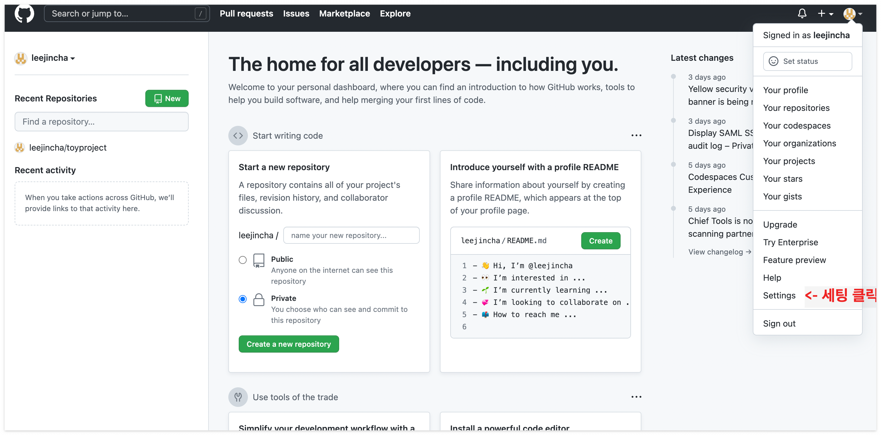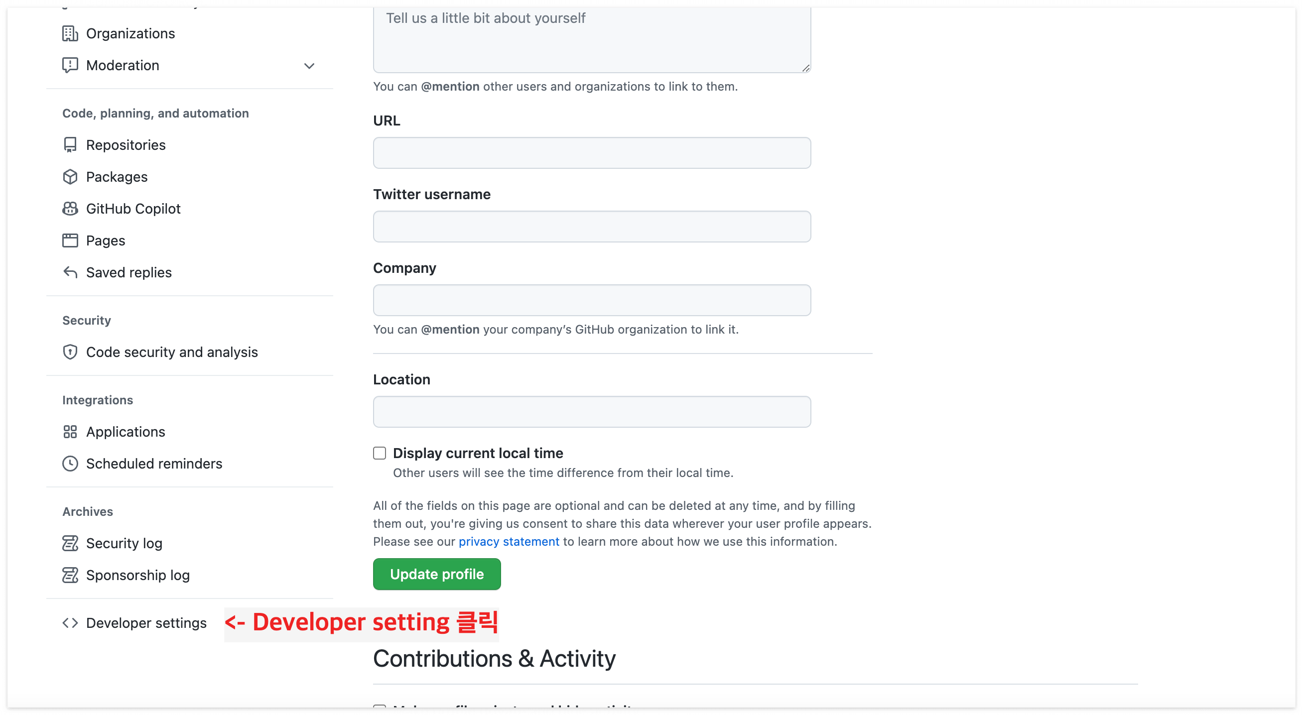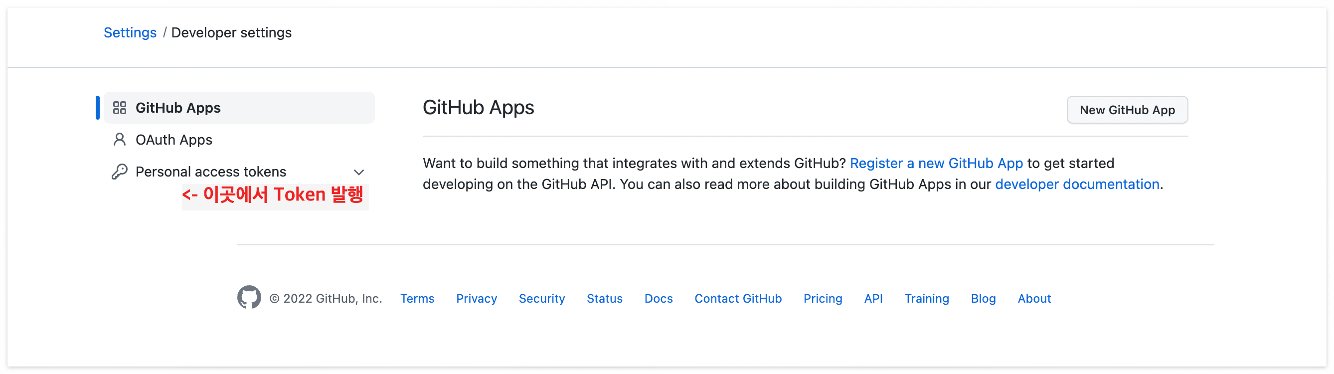 ② 토큰 발행하기 : [Setting] → [Developer setting] → [Personal access tokens]