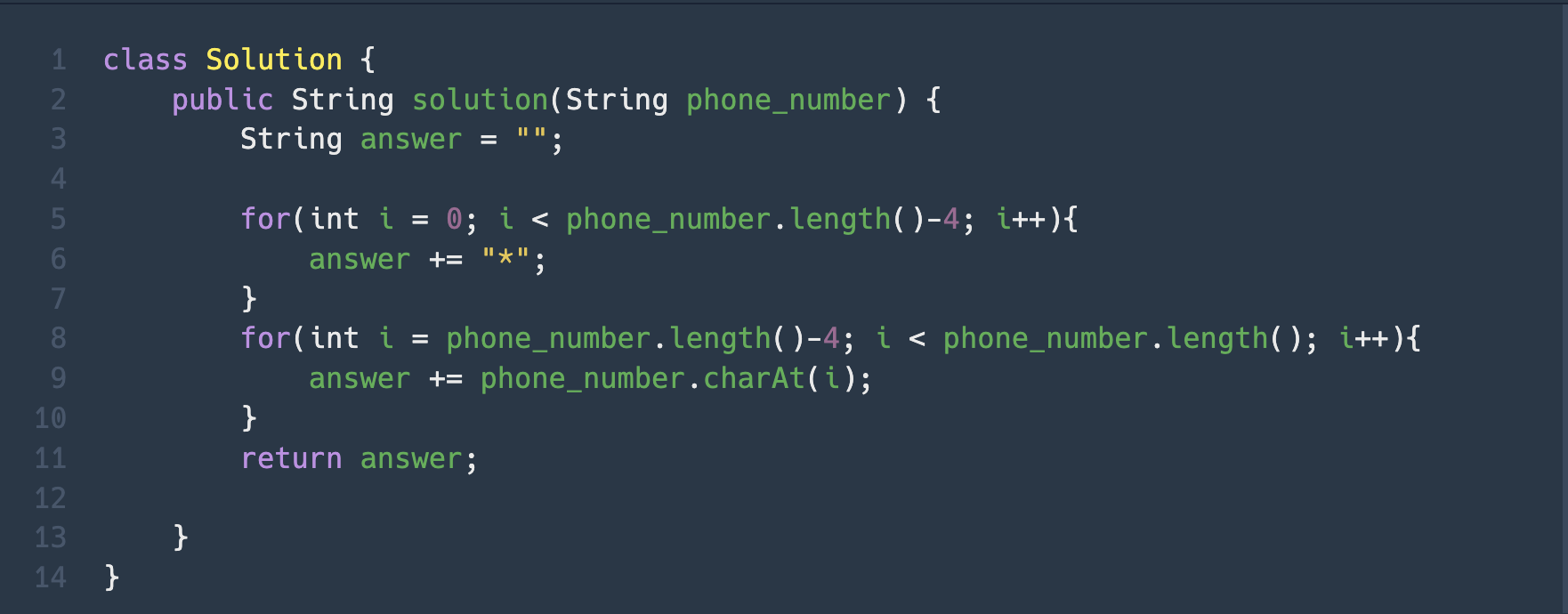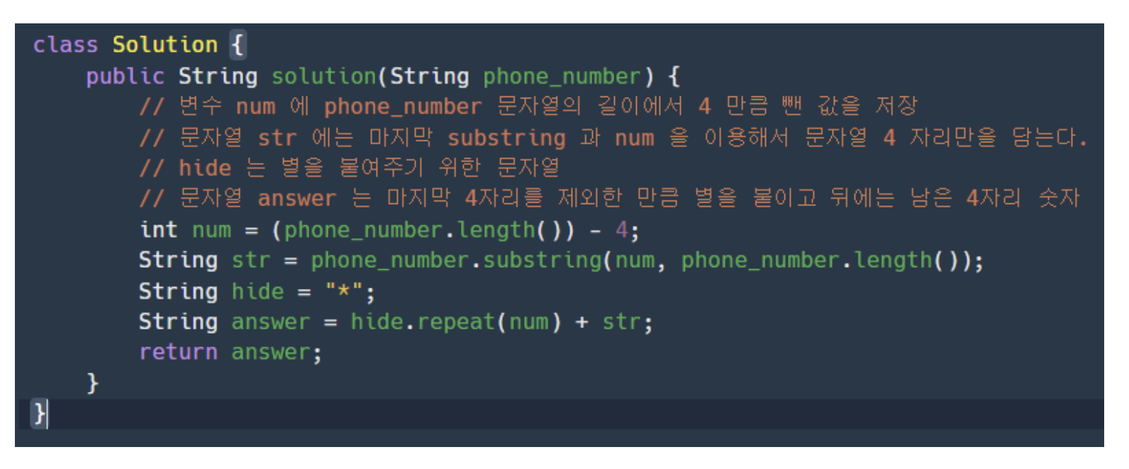 전화번호가 문자열 phone_number로 주어졌을 때, 전화번호의 뒷 4자리를 제외한 나머지 숫자를 전부 *으로 가린 문자열을 리턴하는 함수, solution을 완성해주세요.