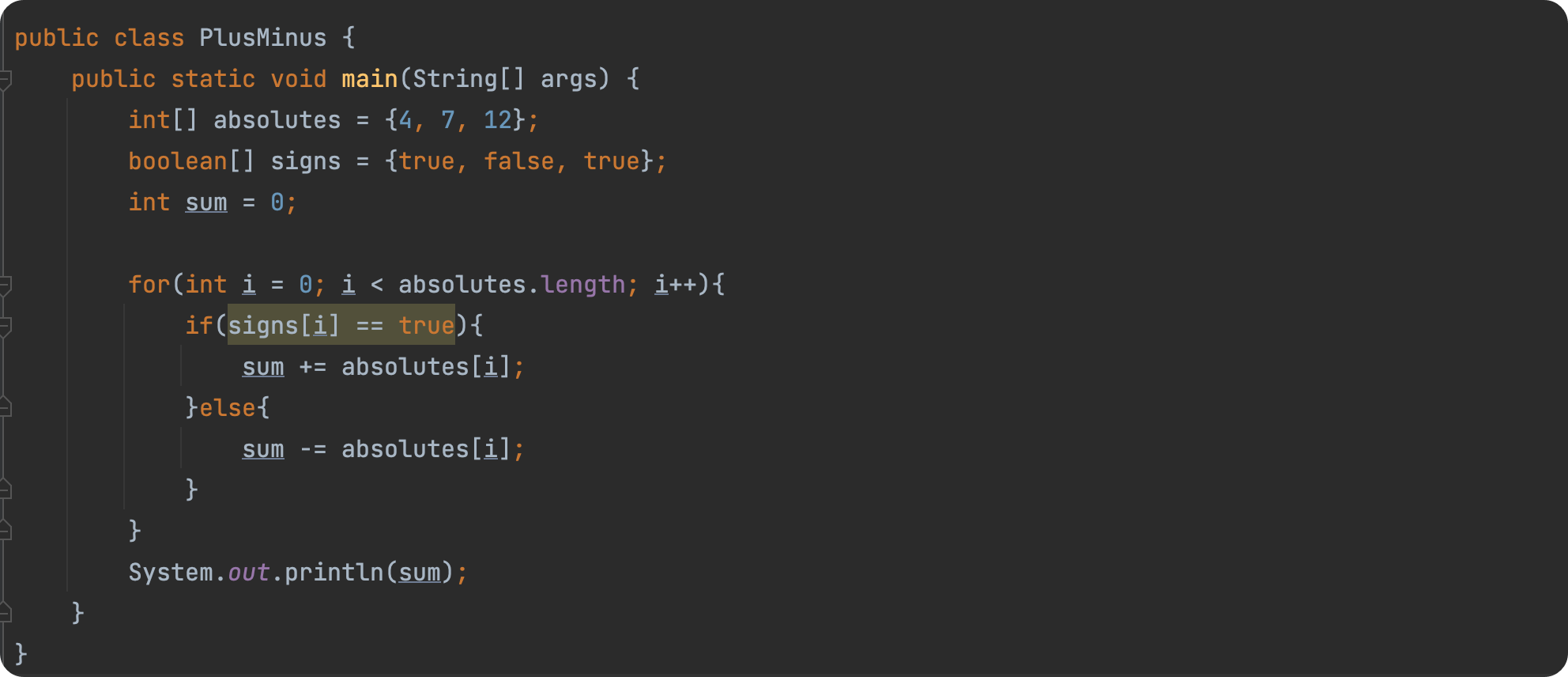 어떤 정수들이 있습니다. 이 정수들의 절댓값을 차례대로 담은 정수 배열 absolutes와 이 정수들의 부호를 차례대로 담은 불리언 배열 signs가 매개변수로 주어집니다. 실제 정수들의 합을 구하여 return 하도록 solution 함수를 완성해주세요.