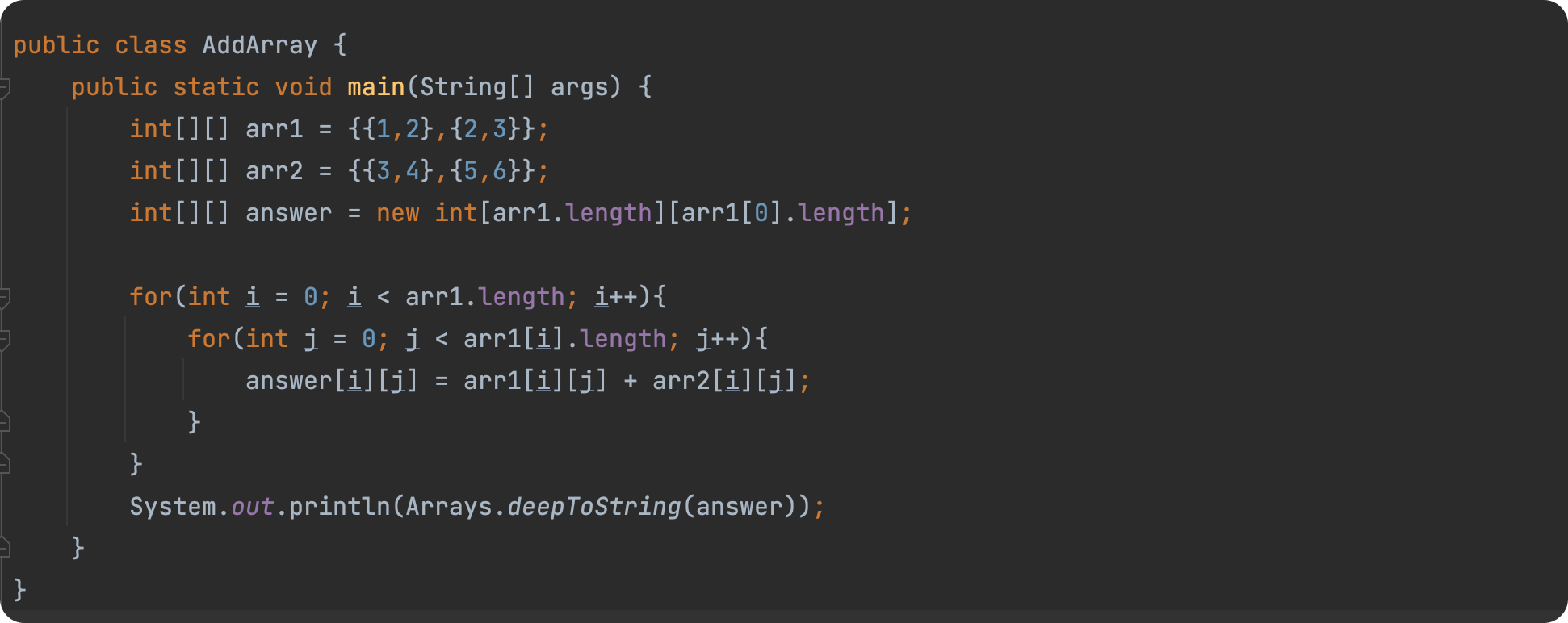 행렬의 덧셈은 행과 열의 크기가 같은 두 행렬의 같은 행, 같은 열의 값을 서로 더한 결과가 됩니다. 2개의 행렬 arr1과 arr2를 입력받아, 행렬 덧셈의 결과를 반환하는 함수, solution을 완성해주세요.