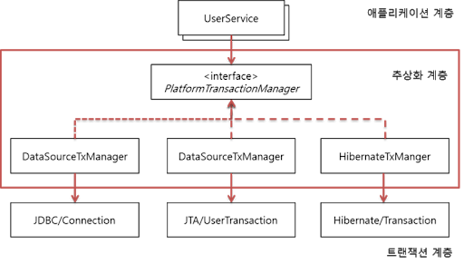 하지만 개발자가 JDBC가 아닌 Hibernate와 같은 기술을 쓴다면 위의 JDBC 종속적인 트랜잭션 동기화 코드들은 문제를 유발하게 된다. 대표적으로 Hibernate에서는 Connection이 아닌 Session이라는 객체를 사용하기 때문이다. 이러한 기술 종속적인 문제를 해결하기 위해 Spring은 트랜잭션 관리 부분을 추상화한 기술을 제공하고 있다.