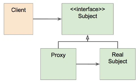 프록시 패턴에서는 interface가 존재하고 Client는 이 interface 타입으로 Proxy 객체를 사용한다. Proxy 객체는 기존의 타겟 객체(Real Subject)를 참조한다. Proxy 객체와 기존의 타겟 객체의 타입은 같고, Proxy는 원래 할 일을 가지고 있는 Real Subject를 감싸서 Client의 요청을 처리한다.