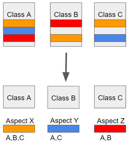 [그림 1]과 같이 클래스 A, B, C에서 공통적으로 나타나는 색깔 블록은 중복되는 메서드, 필드, 코드 등이다. 이때 예를 들어 클래스 A의 주황색 블록 부분을 수정해야 한다면 클래스 B, C의 주황색 부분도 일일이 찾아 수정해야 한다. 이는 SOLID원칙을 위배하며 유지보수를 어렵게 만든다. 이런 식으로 소스 코드상에서 계속 반복해서 사용되는 부분들을흩어진 관심사(Crosscutting Concerns)라고 한다.