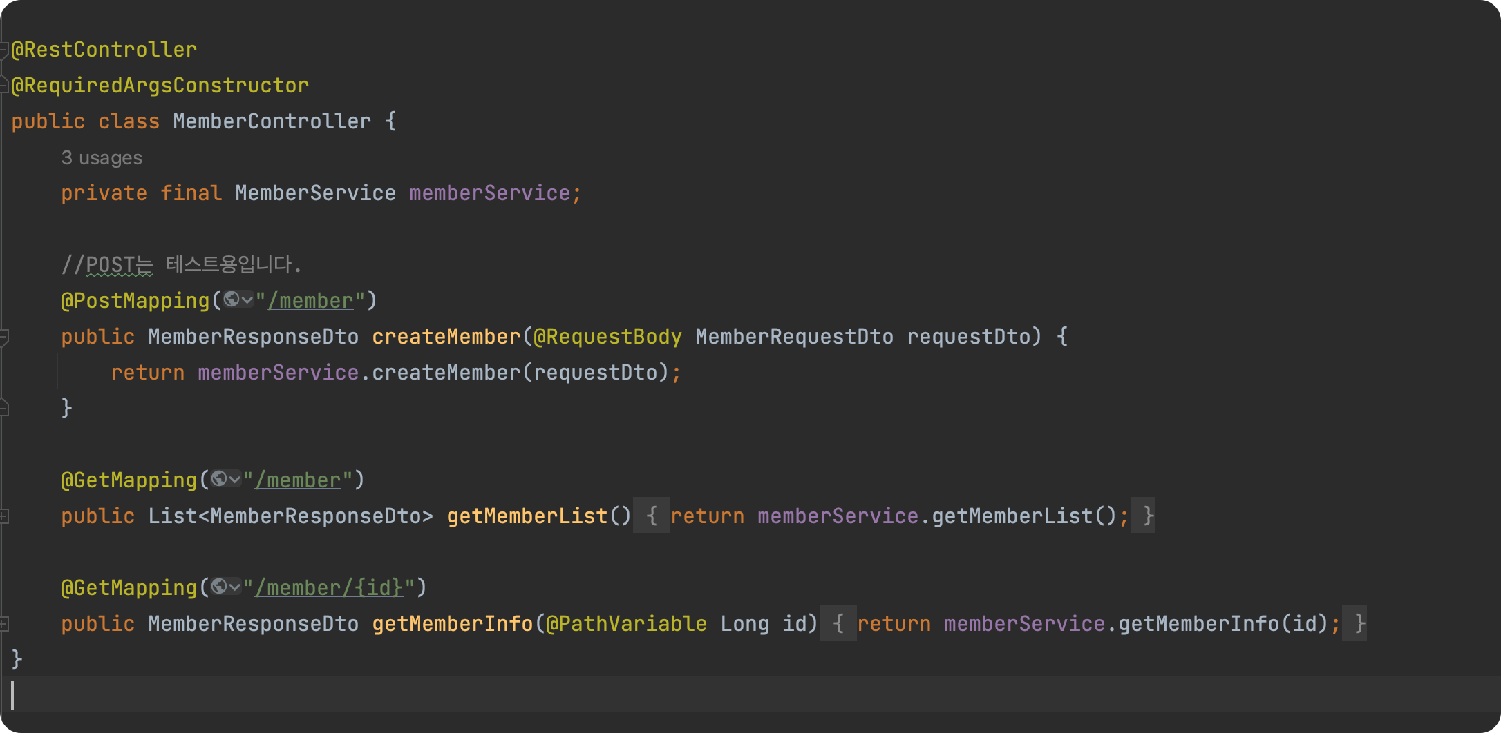 회원정보를 가져올 때는 GET, 회원 추가 시의 행위를 표현하고자 할 때는 POST METHOD를 사용하여 표현합니다.
