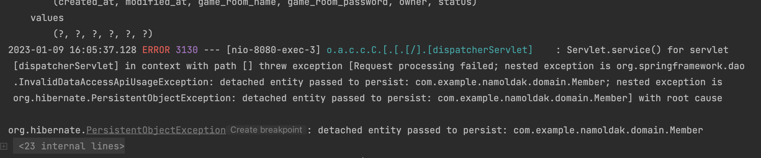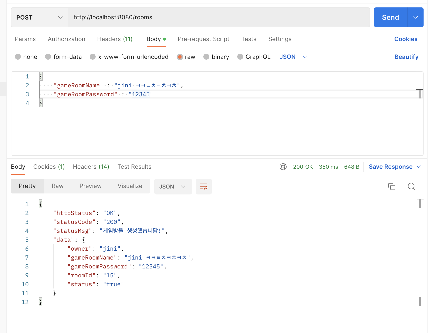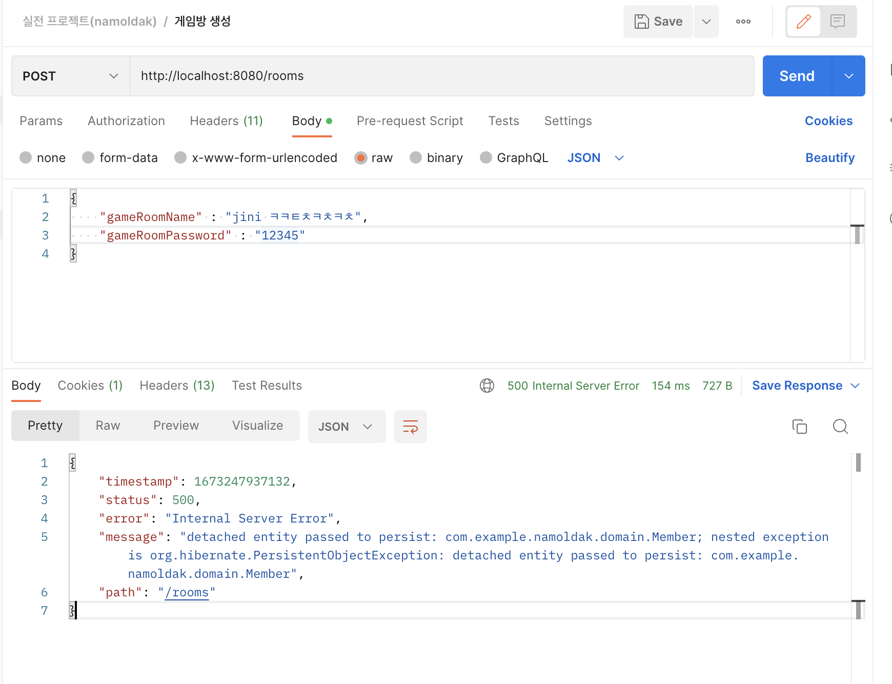 - PostMan으로 게임방 생성하는 API를 테스트하는데 다음과 같은 에러가 발생했다.